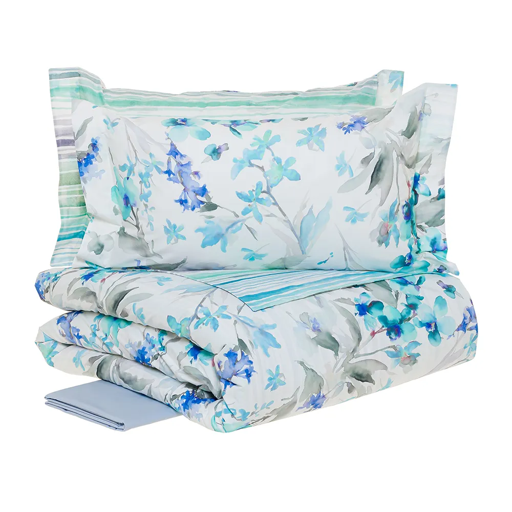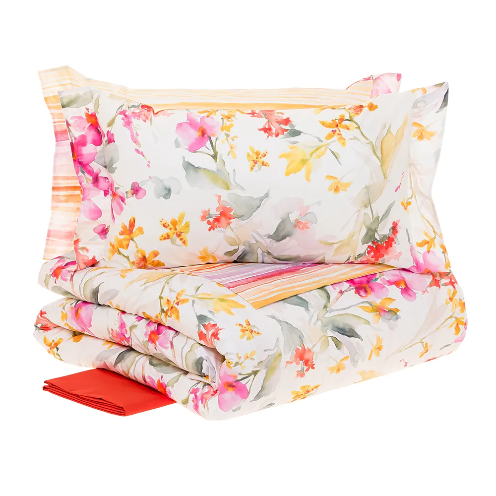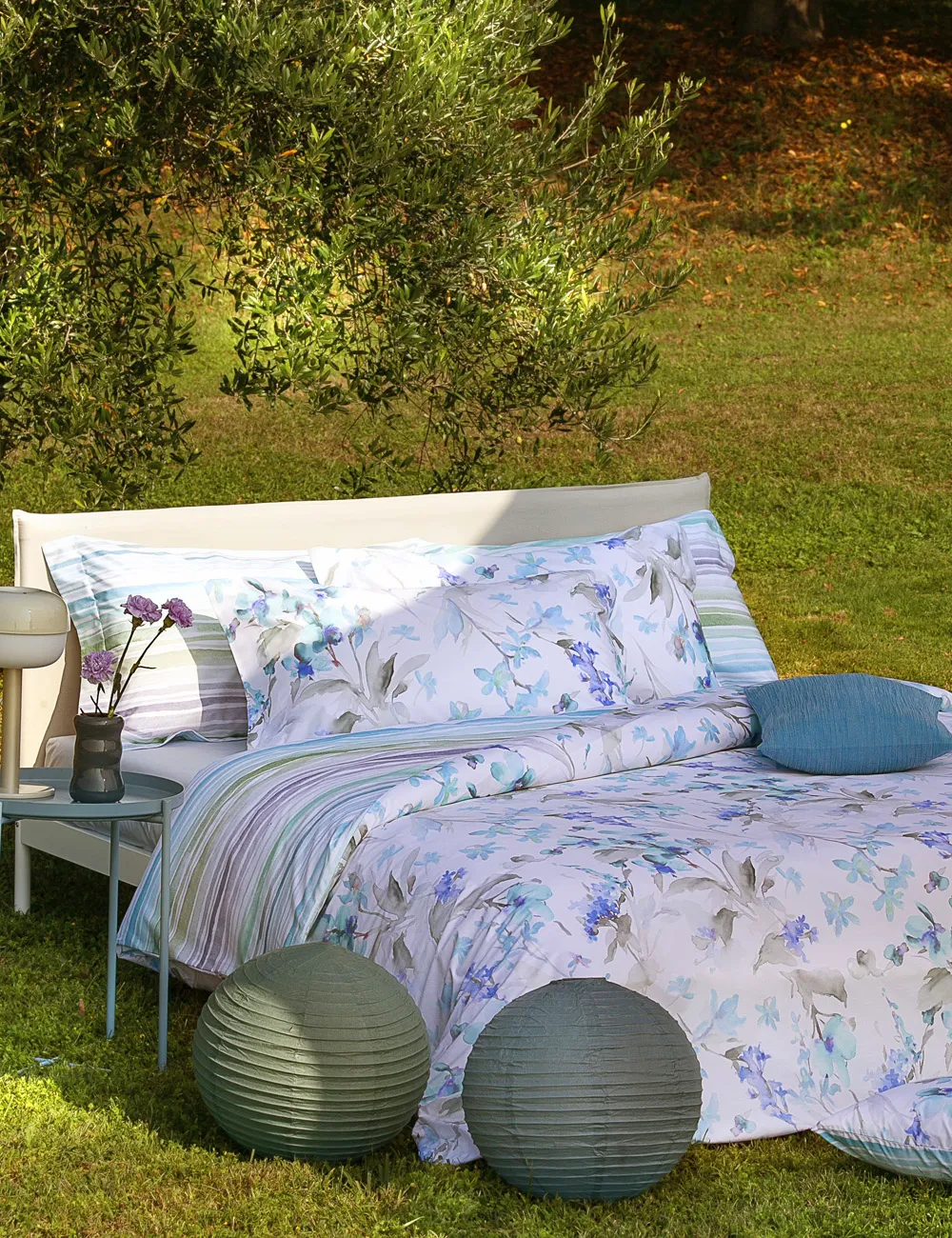 Completo copripiumino realizzato in percalle di cotone. La sacca e le federe a 2 volant sono stampati in digitale con motivi floreali/ geometrici, il sotto con angoli è in tinta unita. Completo copripiumino matrimoniale, composto da: