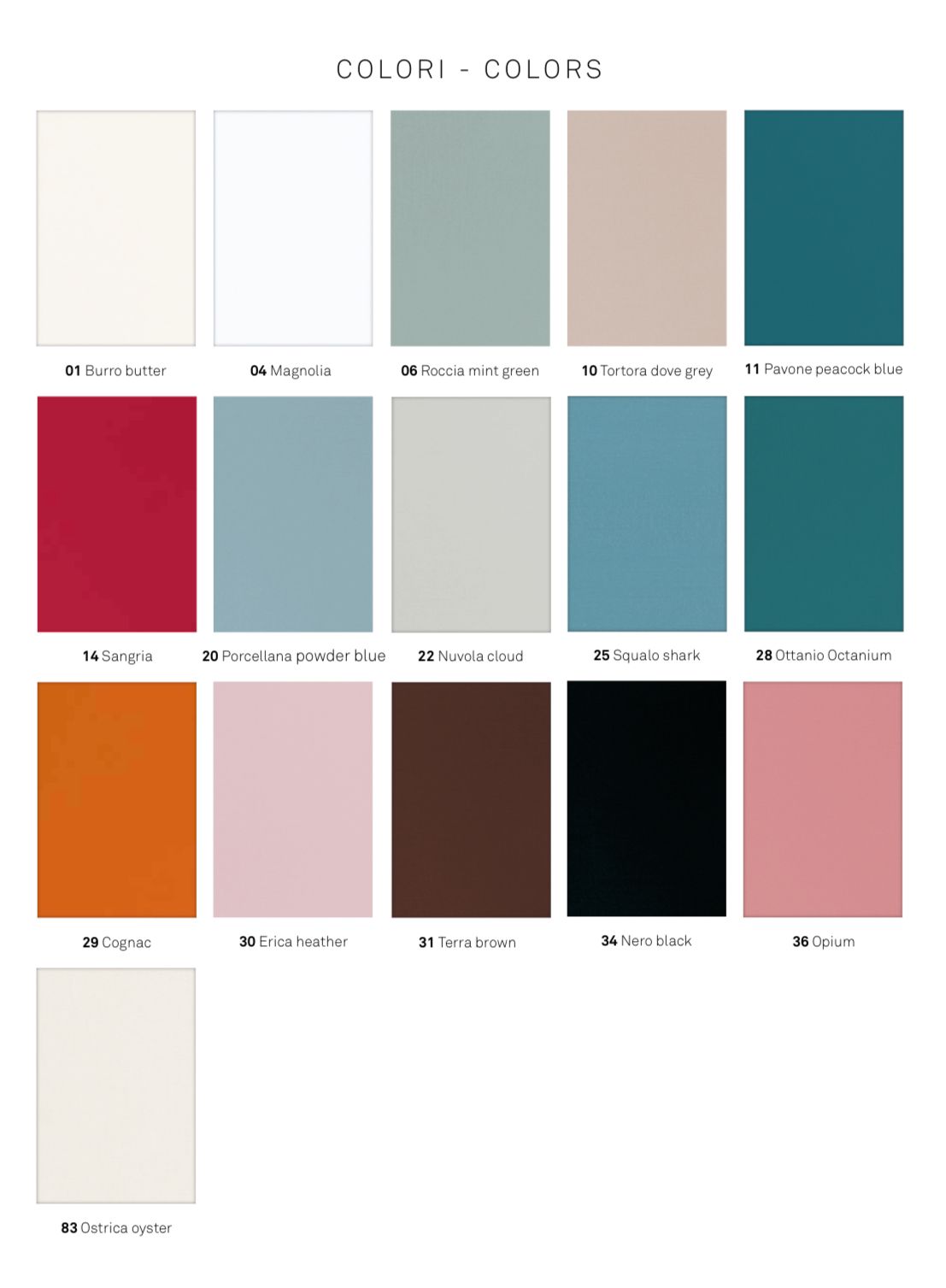04 Magnolia, 06 Roccia, 1 Burro, 10 Tortora, 11 Pavone, 20 Porcellana, 22 Nuvola, 24 Crema, 25 Squalo, 28 Ottanio, 29 Cognac, 30 Erica, 31 Terra, 34 Nero, 36 Opium, 44 Amaranto, 83 Ostrica |