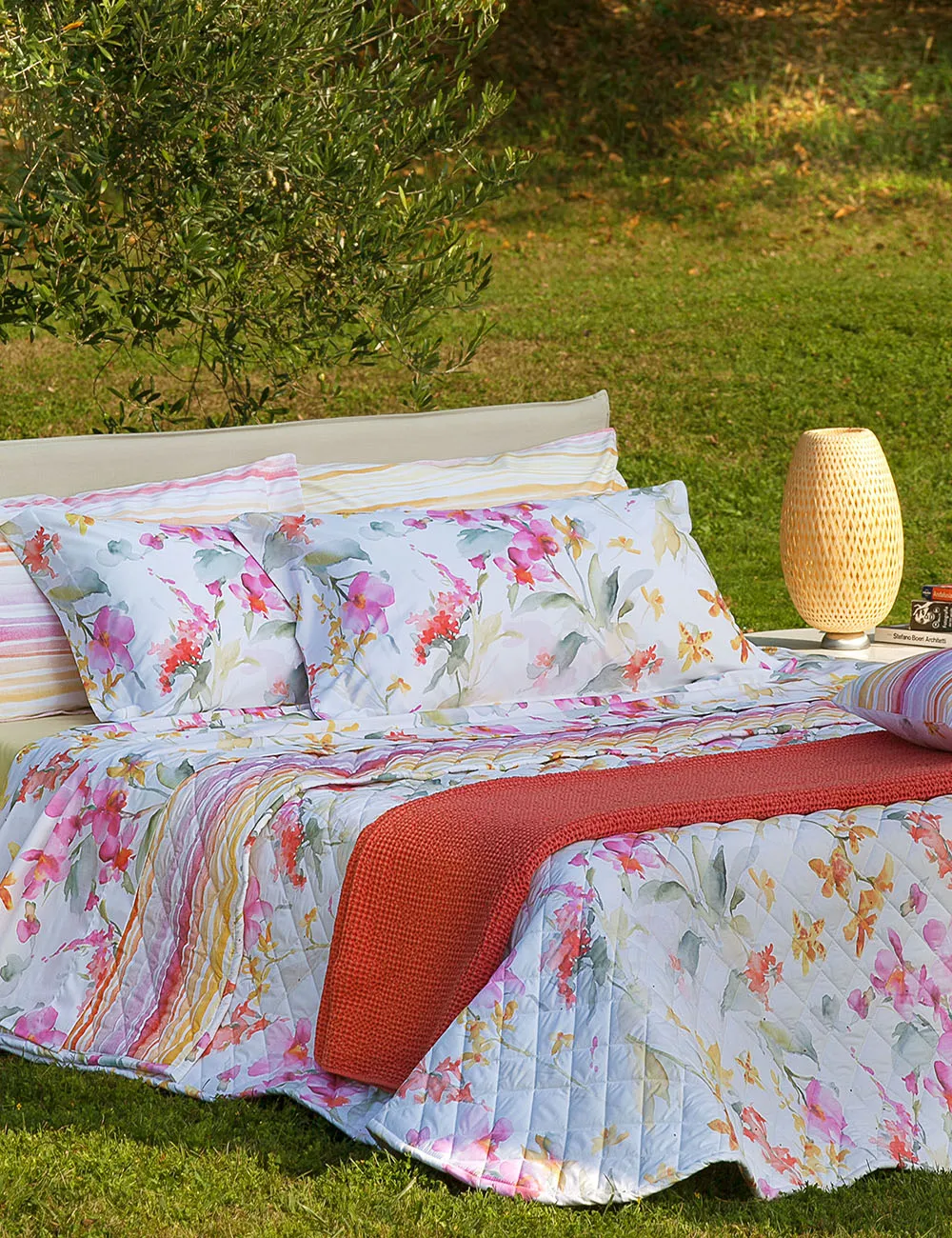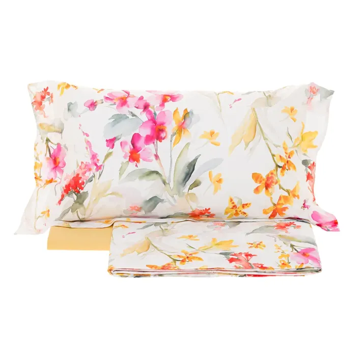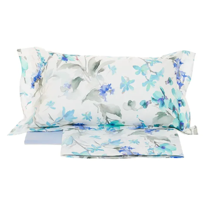 Completo lenzuola matrimoniale con balza a giorno realizzato in percalle di cotone. Il lenzuolo e le federe a 3 volant sono stampati in digitale con motivi floreali/geometrici, il sotto con angoli è in tinta unita. Completo lenzuola matrimoniale, composto da: