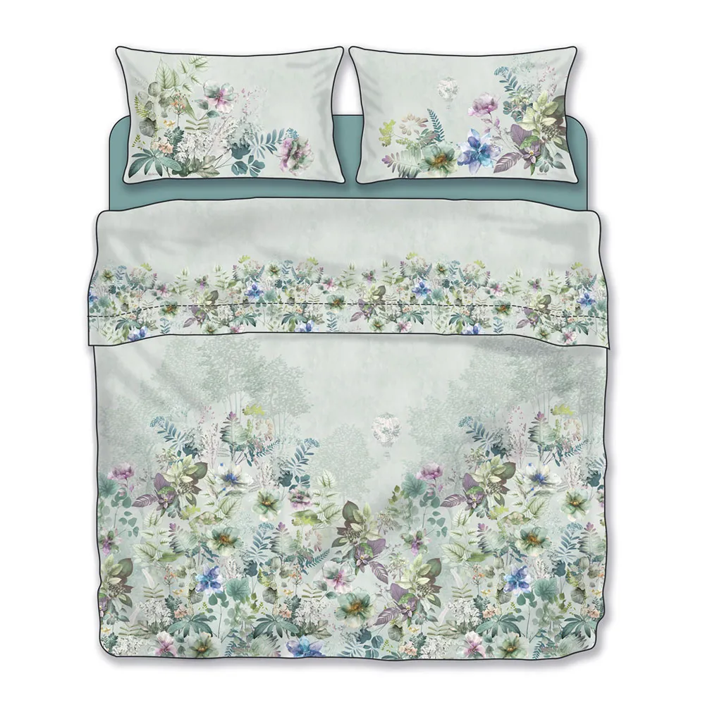 Il lenzuolo e la parte superiore delle federe sono stampati in digitale con delicati motivi floreali; la parte inferiore delle federe e il lenzuolo sotto con angoli sono in raso tinta unita