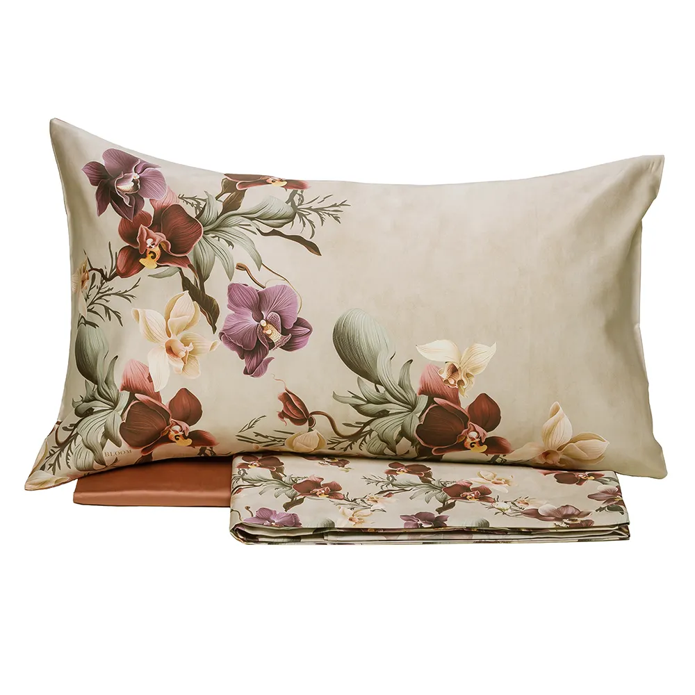 Completo lenzuola con balza a giorno realizzata in raso di puro cotone 300 T.C. Il lenzuolo e la parte superiore delle federe sono stampati in digitale con delicati motivi floreali; la parte inferiore delle federe e il lenzuolo sotto con angoli sono in raso tinta unita. Completo lenzuola matrimoniale, composto da: