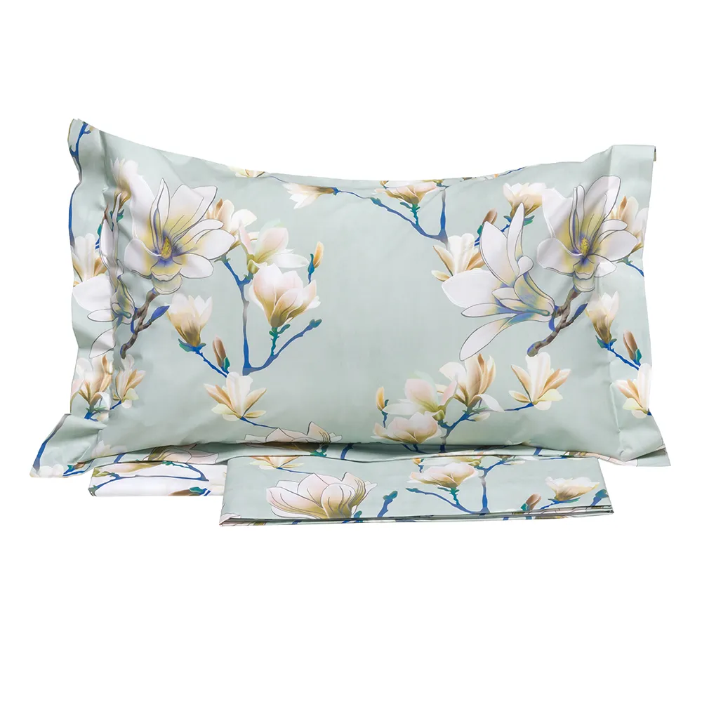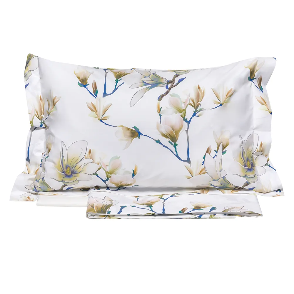 Il lenzuolo e le federe a 3 volant sono stampati in digitale con motivi floreali, il sotto con angoli è in stampato.