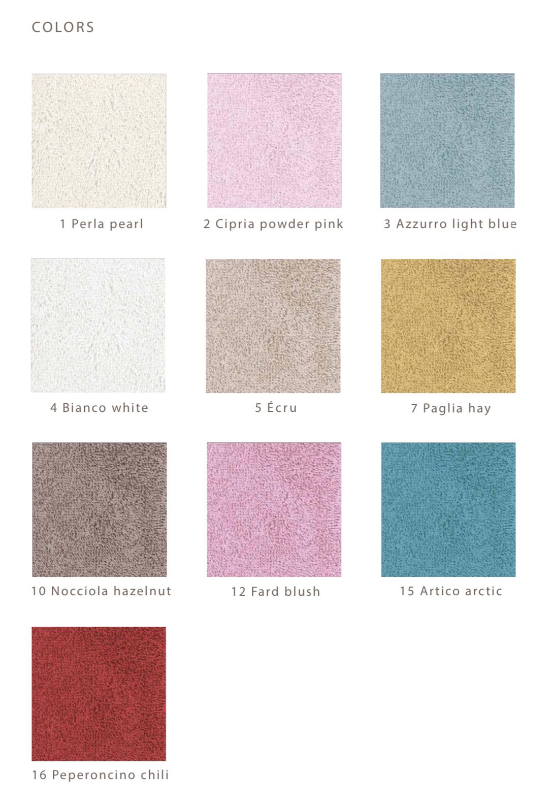 01 Perla, 02 Cipria, 03 Azzurro, 04 Bianco, 05 Ecrù, 07 Paglia, 10 Nocciola, 12 Fard, 15 Artico, 16 Peperoncino |