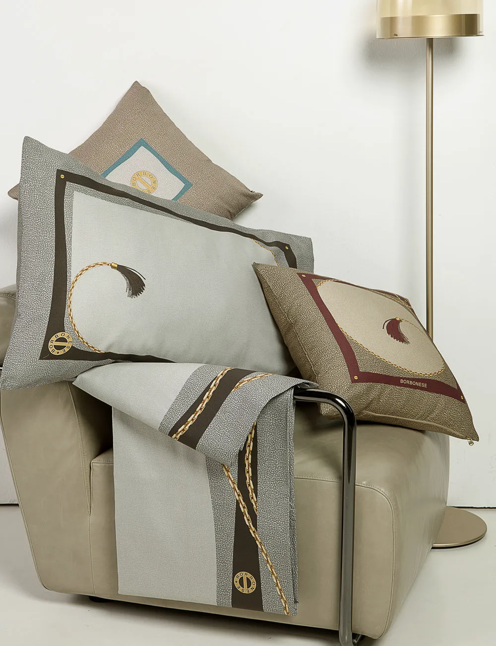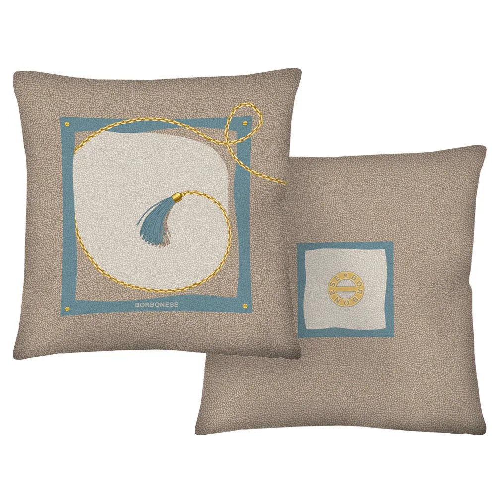 Cuscino arredo double-face in raso di puro cotone 300 T.C. La parte superiore è stampata con design personalizzato dall’iconica texture “OP” Occhio di Pernice; la parte inferiore con motivo “OP” coordinato. Confezionato con zip e cursore personalizzato, comodamente sfoderabile. La soffice imbottitura è in poliestere. Disponibile in tre varianti di colore