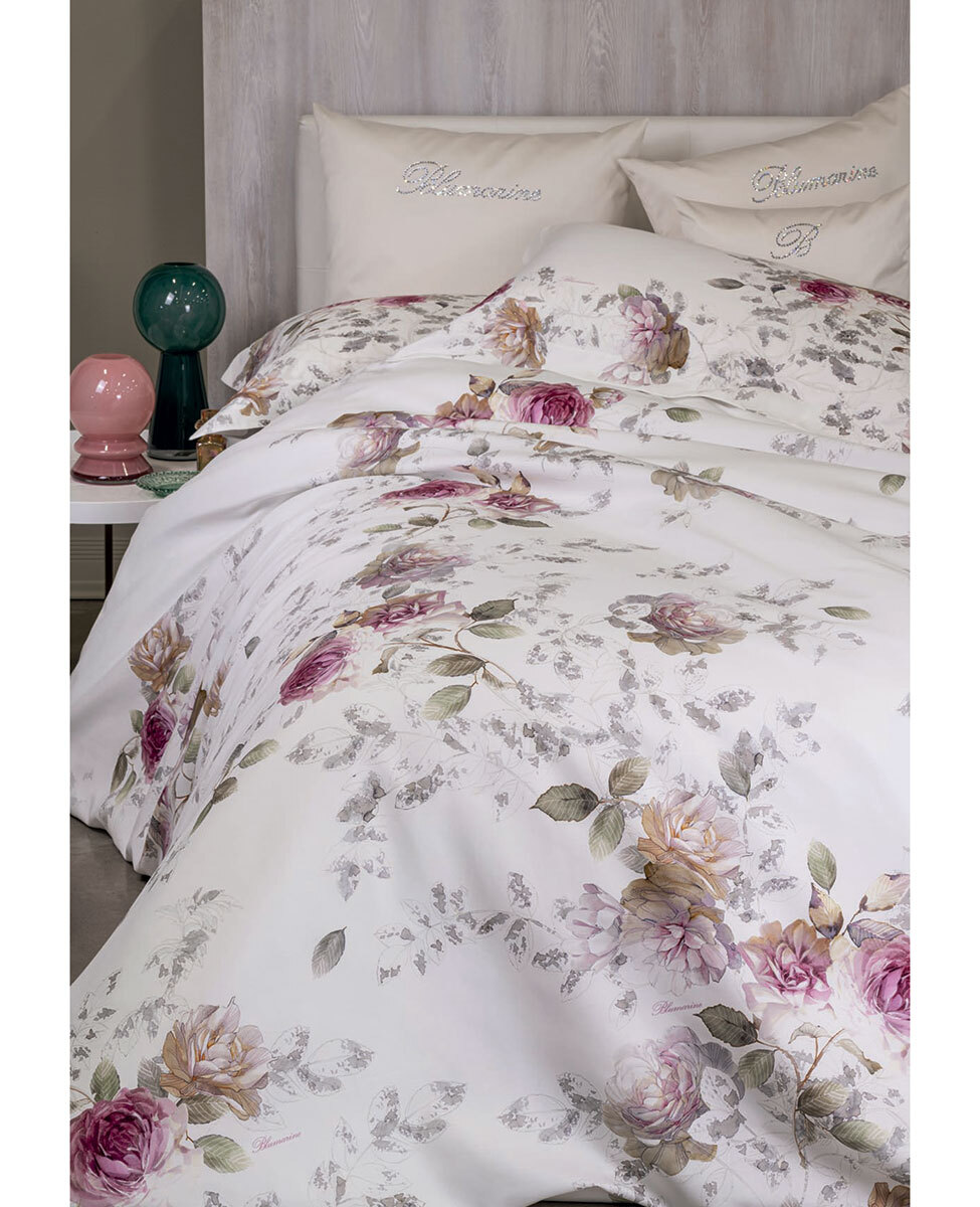 Parure copripiumino matrimoniale in rasatello con stampa all-over, federe a 3 volani con stampa piazzata, sotto sacca e lenzuolo sotto in raso tinta unita, logo Blumarine stampato nel tessuto. Set 3 pezzi composto da: 1 sacca copripiumino 250×200 cm 2 federe a 3 volani 50×80 cm Il lenzuolo di sotto non è incluso.
