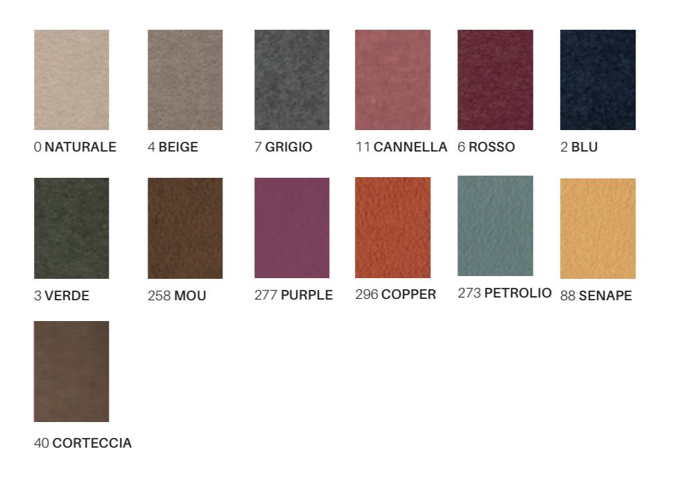 0 Naturale, 11 Cannella, 2 Blu, 258 Mou, 273 Petrolio, 277 Purple, 296 Copper, 3 Verde, 4 Beige, 40 Corteccia, 6 Rosso, 7 Grigio, 88 Senape |