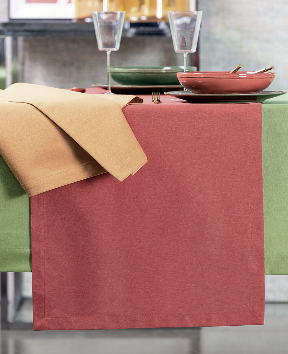 Runner in cotone panama tinta unita, rifinito con angoli a cappuccio. Realizzato in tessuto Bionic-Finish®: BIONIC-FINISH® è il primo sistema idrorepellente completo a livello mondiale per l’industria tessile. Grazie alla lunga ricerca e ai diversi trattamenti a cui può essere combinato il sistema BIONIC-FINISH® garantisce massima traspirabilità e consente al tessuto di mantenere una mano molto morbida, altissimo comfort, un’eccellente durata nel tempo e colori sempre nuovi e brillanti. Ma non è tutto: la composizione di questo agente impermeabilizzante offre il vantaggio di un’asciugatura estremamente rapida. Misure: 45×150 cm Tessuto: 64% cotone 36% poliestere
