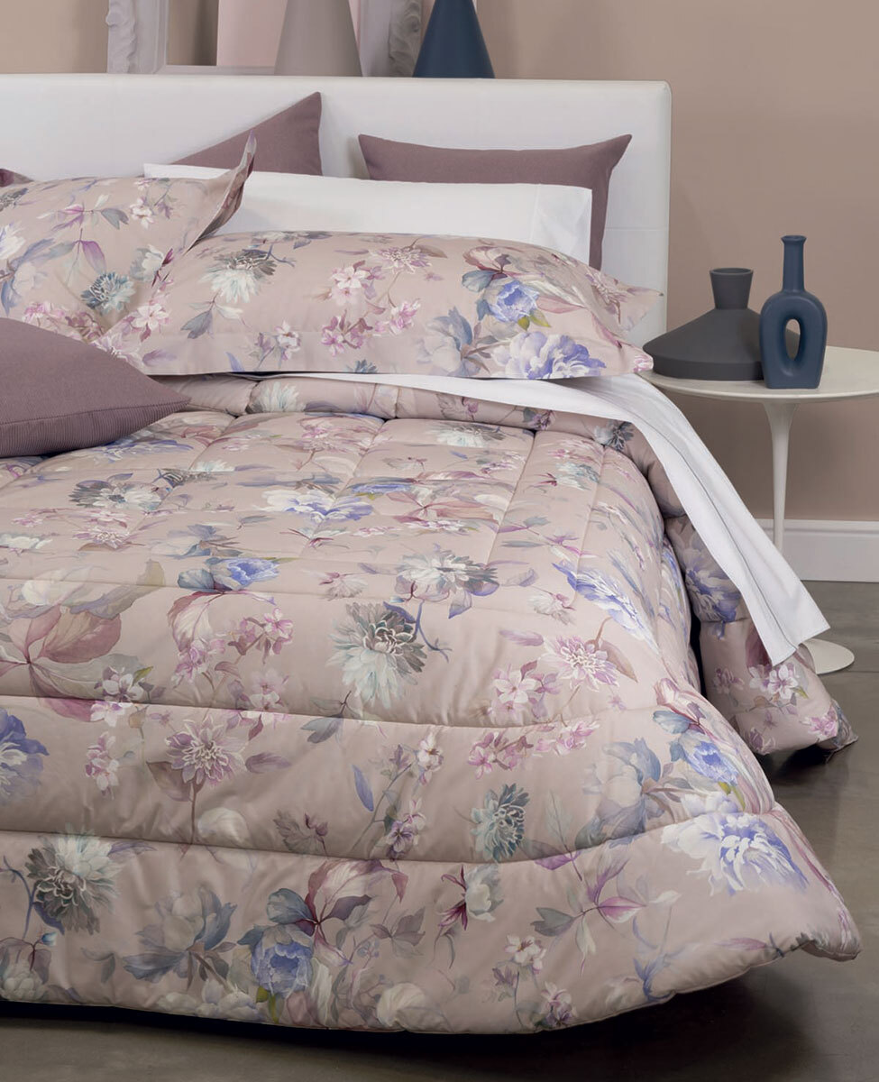 Trapunta invernale matrimoniale in percalle di cotone con stampa all over. Grammatura: 340 gr/mq. Disponibile in due varianti di colore.